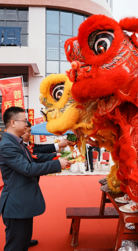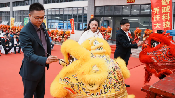 鼓铿锵震四方,瑞狮腾跃送吉祥,庆典在铿锵的锣鼓声中拉开序幕。舞狮团队随着激昂音乐跃动,瞬间点燃全场气氛。普诚科技董事长郭谦先生与总裁郁为民先生手持金笔为祥狮点睛,朱砂落定,祥狮即刻灵动起来,腾跃翻滚间完成”登高采青“。